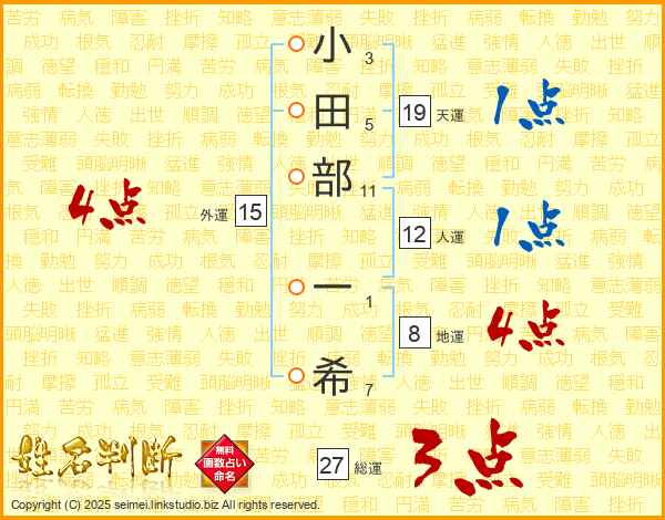 小(3画)田(5画)部(11画) 一(1画)希(7画)