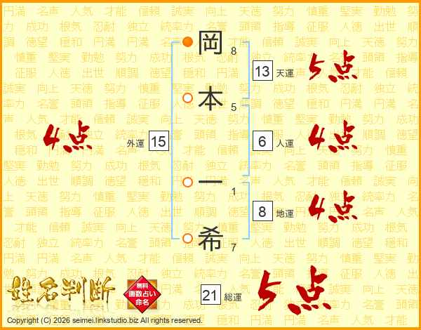 岡(8画)本(5画) 一(1画)希(7画)