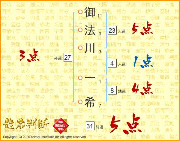 御法川一希さんの総運は31画の5点!