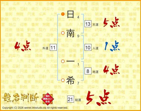 生活面を象徴する運勢です。外部から受ける影響力を表し、結婚運、家庭運や職場、環境への順応性を表します。総運から人運を引いた画数。姓や名が1文字の場合を除く。