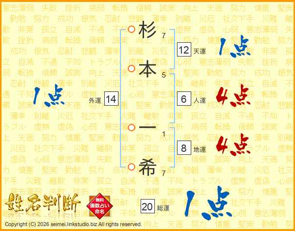 あなたの人生を表す1番重要な運勢です。生涯を通じて影響する総合運となり、主に50歳以降の晩年期に影響を及ぼします。苗字と名前の合計画数。