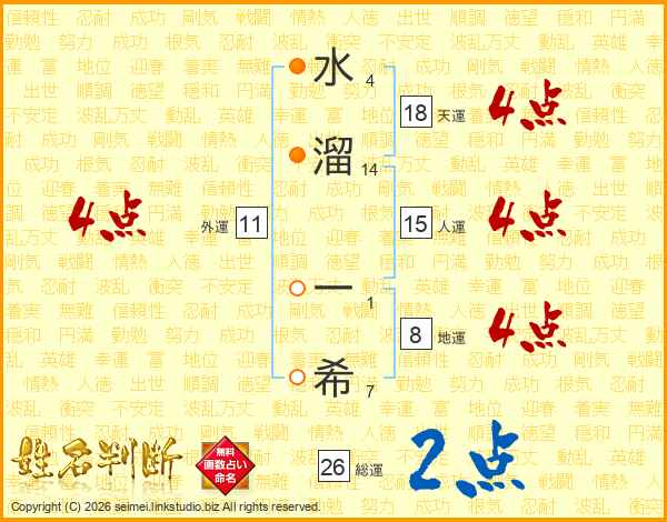 生活面を象徴する運勢です。外部から受ける影響力を表し、結婚運、家庭運や職場、環境への順応性を表します。総運から人運を引いた画数。姓や名が1文字の場合を除く。