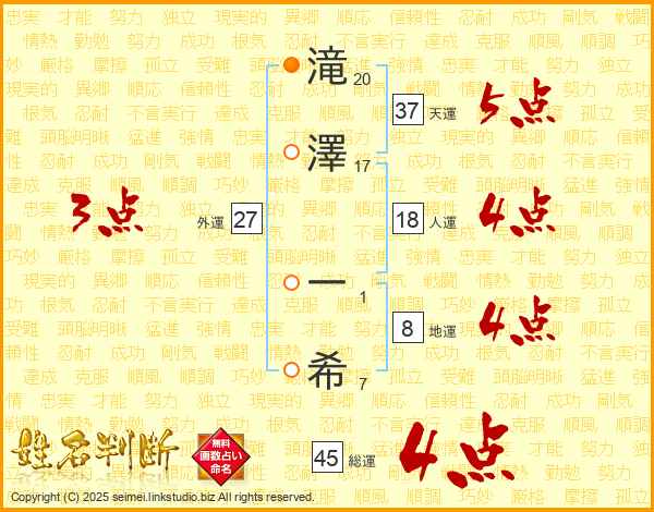 生活面を象徴する運勢です。外部から受ける影響力を表し、結婚運、家庭運や職場、環境への順応性を表します。総運から人運を引いた画数。姓や名が1文字の場合を除く。
