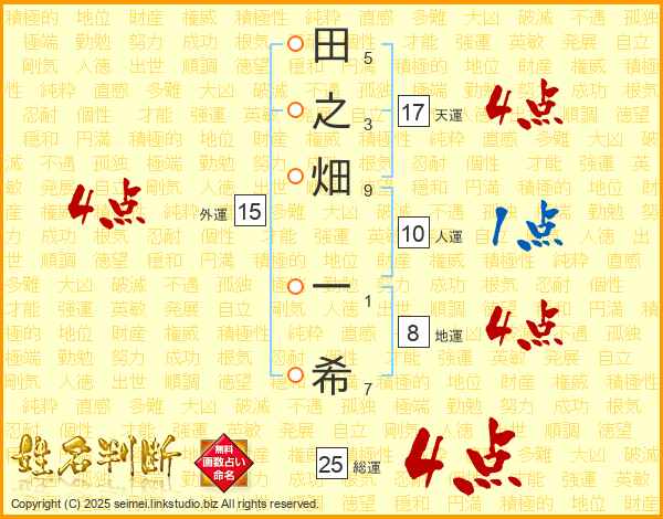 田(5画)之(3画)畑(9画) 一(1画)希(7画)
