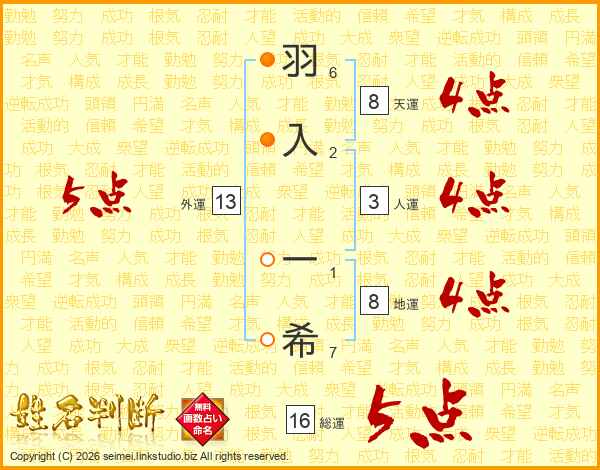 あなたの人生を表す1番重要な運勢です。生涯を通じて影響する総合運となり、主に50歳以降の晩年期に影響を及ぼします。苗字と名前の合計画数。