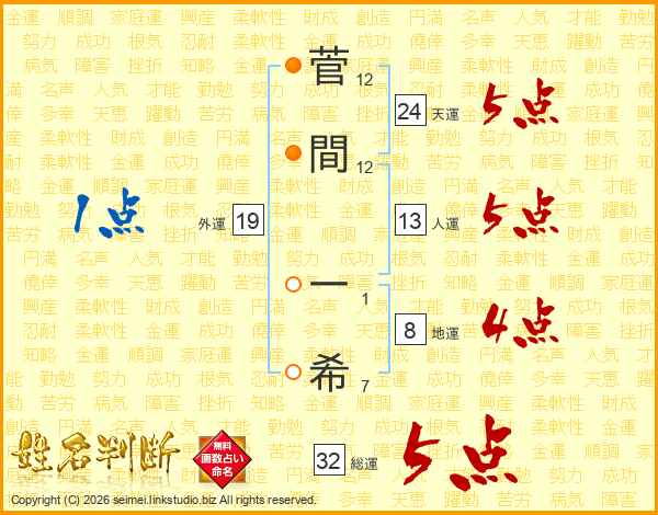 菅間一希さんの総運は32画の5点!