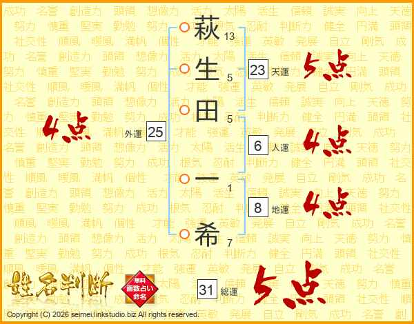 萩(13画)生(5画)田(5画) 一(1画)希(7画)