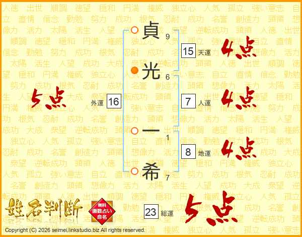 あなたの人生を表す1番重要な運勢です。生涯を通じて影響する総合運となり、主に50歳以降の晩年期に影響を及ぼします。苗字と名前の合計画数。