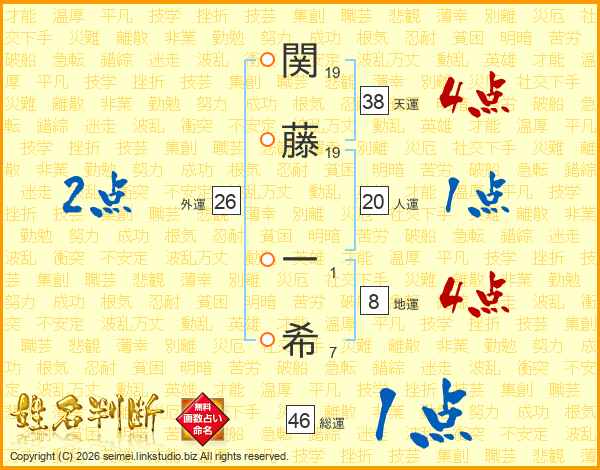 生活面を象徴する運勢です。外部から受ける影響力を表し、結婚運、家庭運や職場、環境への順応性を表します。総運から人運を引いた画数。姓や名が1文字の場合を除く。
