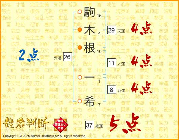 駒(15画)木(4画)根(10画) 一(1画)希(7画)