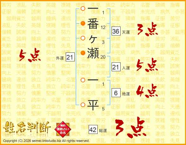 あなたの人生を表す1番重要な運勢です。生涯を通じて影響する総合運となり、主に50歳以降の晩年期に影響を及ぼします。苗字と名前の合計画数。