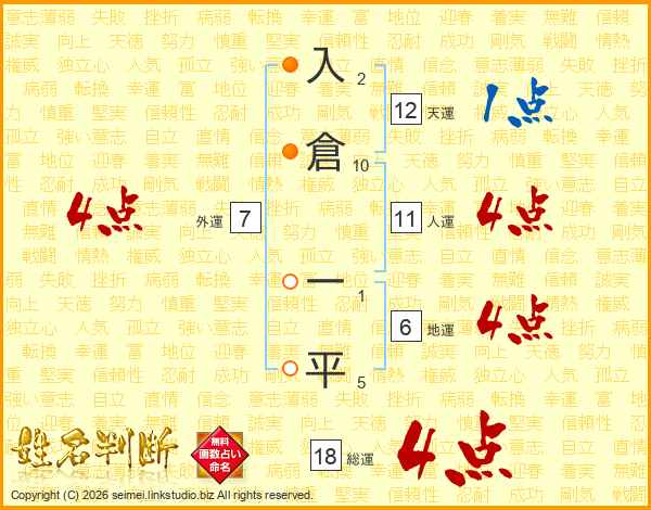 生活面を象徴する運勢です。外部から受ける影響力を表し、結婚運、家庭運や職場、環境への順応性を表します。総運から人運を引いた画数。姓や名が1文字の場合を除く。