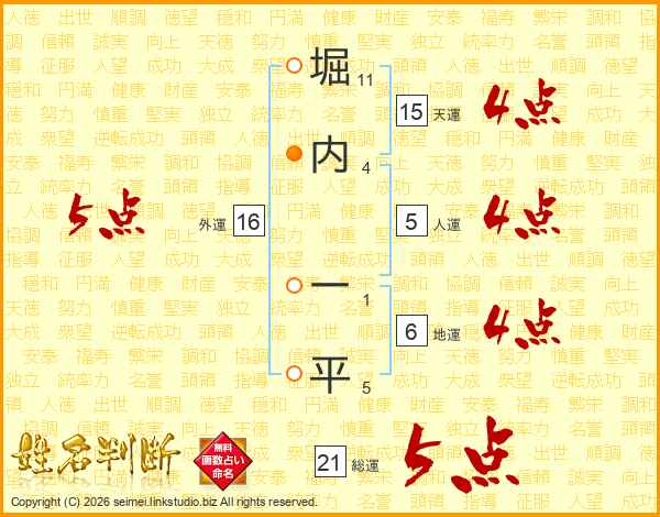 堀(11画)内(4画) 一(1画)平(5画)