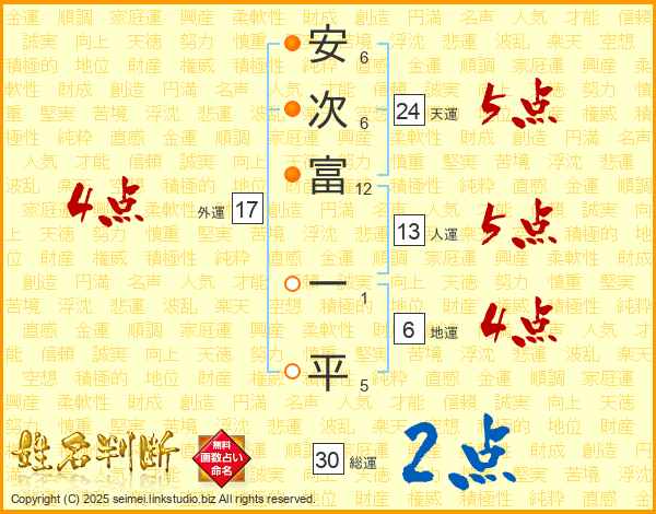 安(6画)次(6画)富(12画) 一(1画)平(5画)