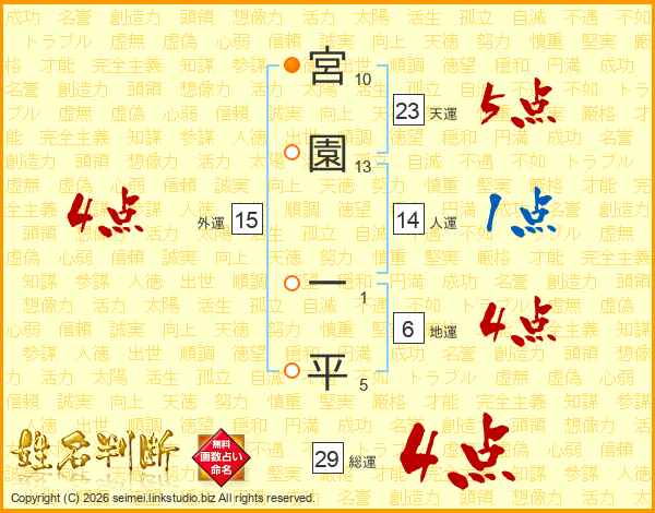 生活面を象徴する運勢です。外部から受ける影響力を表し、結婚運、家庭運や職場、環境への順応性を表します。総運から人運を引いた画数。姓や名が1文字の場合を除く。