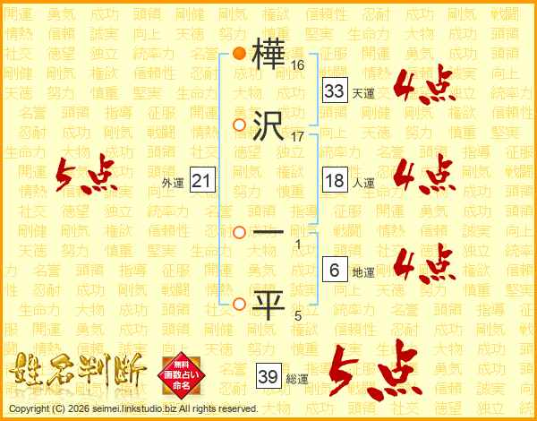 あなたの人生を表す1番重要な運勢です。生涯を通じて影響する総合運となり、主に50歳以降の晩年期に影響を及ぼします。苗字と名前の合計画数。