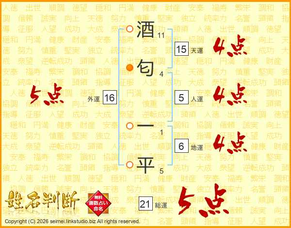 生活面を象徴する運勢です。外部から受ける影響力を表し、結婚運、家庭運や職場、環境への順応性を表します。総運から人運を引いた画数。姓や名が1文字の場合を除く。