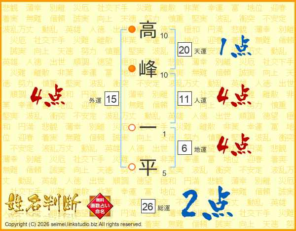 あなたの人生を表す1番重要な運勢です。生涯を通じて影響する総合運となり、主に50歳以降の晩年期に影響を及ぼします。苗字と名前の合計画数。