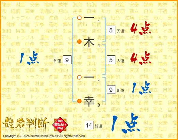 生活面を象徴する運勢です。外部から受ける影響力を表し、結婚運、家庭運や職場、環境への順応性を表します。総運から人運を引いた画数。姓や名が1文字の場合を除く。