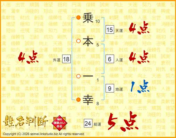 生活面を象徴する運勢です。外部から受ける影響力を表し、結婚運、家庭運や職場、環境への順応性を表します。総運から人運を引いた画数。姓や名が1文字の場合を除く。