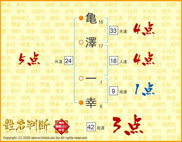 亀(16画)澤(17画) 一(1画)幸(8画)