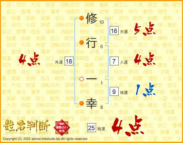 生活面を象徴する運勢です。外部から受ける影響力を表し、結婚運、家庭運や職場、環境への順応性を表します。総運から人運を引いた画数。姓や名が1文字の場合を除く。