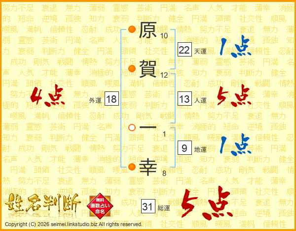 生活面を象徴する運勢です。外部から受ける影響力を表し、結婚運、家庭運や職場、環境への順応性を表します。総運から人運を引いた画数。姓や名が1文字の場合を除く。