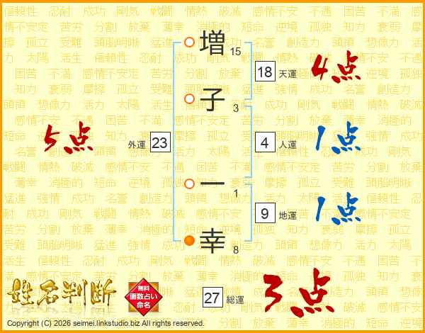 あなたの人生を表す1番重要な運勢です。生涯を通じて影響する総合運となり、主に50歳以降の晩年期に影響を及ぼします。苗字と名前の合計画数。