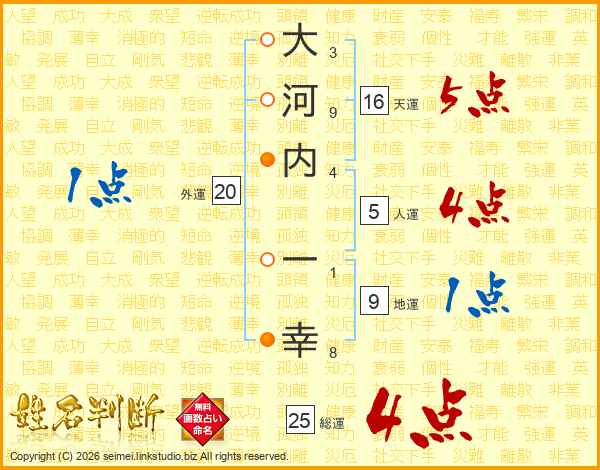 大(3画)河(9画)内(4画) 一(1画)幸(8画)