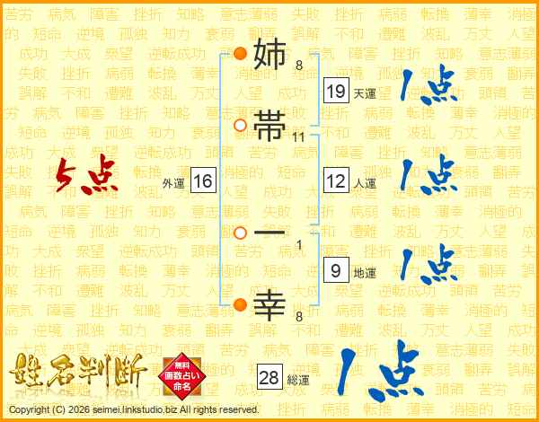 姉(8画)帯(11画) 一(1画)幸(8画)