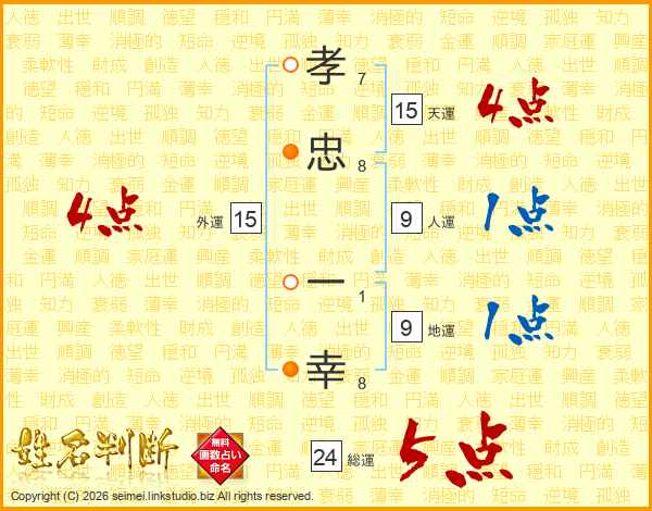 孝(7画)忠(8画) 一(1画)幸(8画)