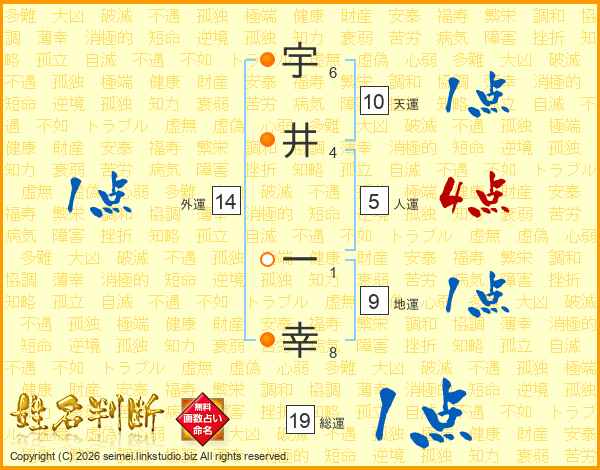 生活面を象徴する運勢です。外部から受ける影響力を表し、結婚運、家庭運や職場、環境への順応性を表します。総運から人運を引いた画数。姓や名が1文字の場合を除く。