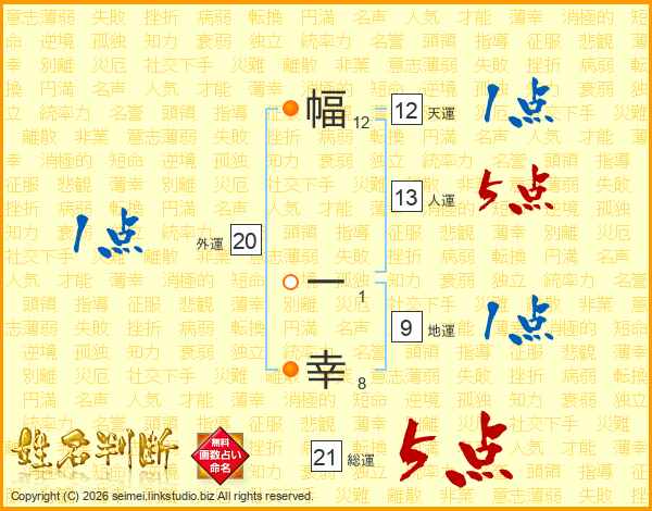生活面を象徴する運勢です。外部から受ける影響力を表し、結婚運、家庭運や職場、環境への順応性を表します。総運から人運を引いた画数。姓や名が1文字の場合を除く。