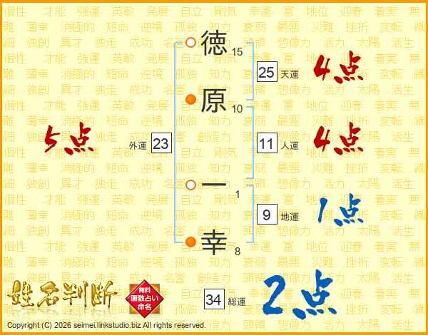 生活面を象徴する運勢です。外部から受ける影響力を表し、結婚運、家庭運や職場、環境への順応性を表します。総運から人運を引いた画数。姓や名が1文字の場合を除く。