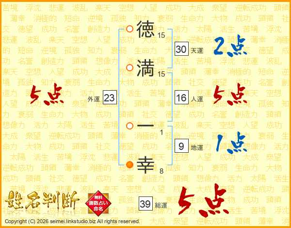 生活面を象徴する運勢です。外部から受ける影響力を表し、結婚運、家庭運や職場、環境への順応性を表します。総運から人運を引いた画数。姓や名が1文字の場合を除く。