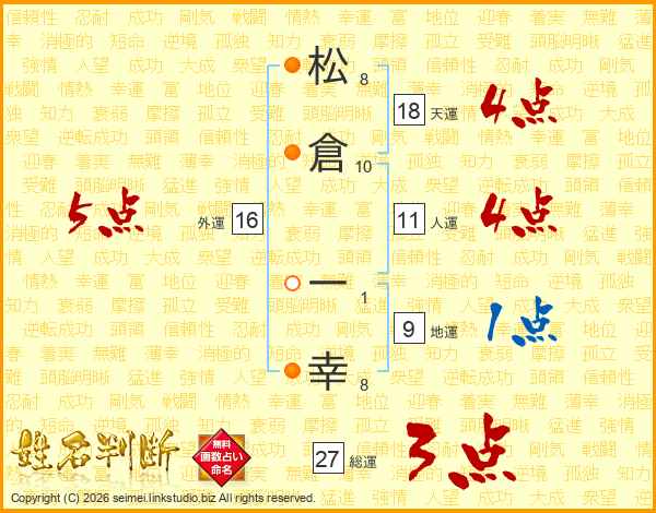 あなたの人生を表す1番重要な運勢です。生涯を通じて影響する総合運となり、主に50歳以降の晩年期に影響を及ぼします。苗字と名前の合計画数。