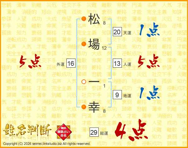 松(8画)場(12画) 一(1画)幸(8画)