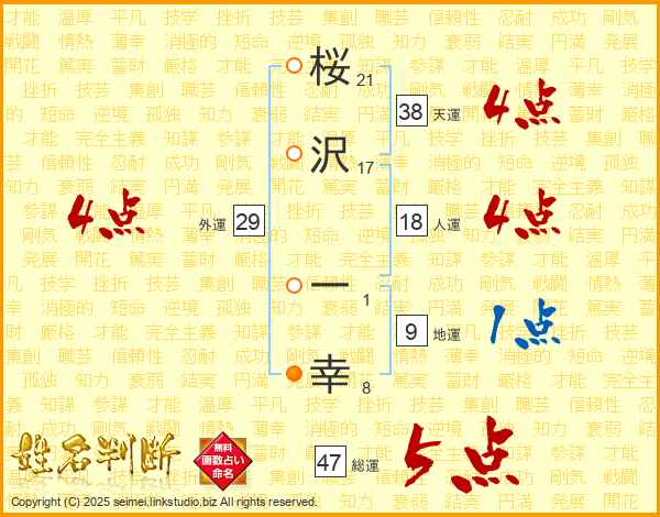 桜(21画)沢(17画) 一(1画)幸(8画)