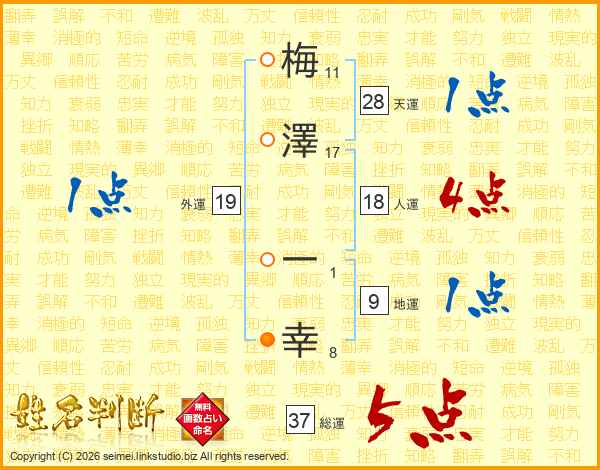 梅(11画)澤(17画) 一(1画)幸(8画)