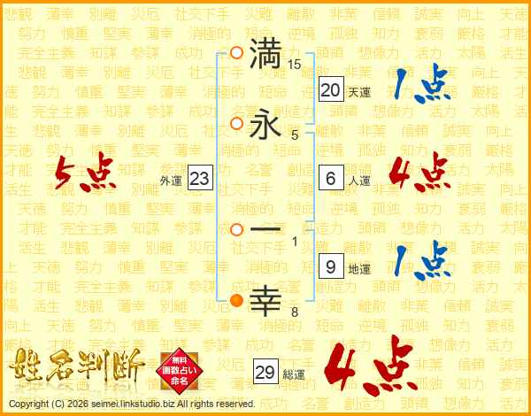 満(15画)永(5画) 一(1画)幸(8画)