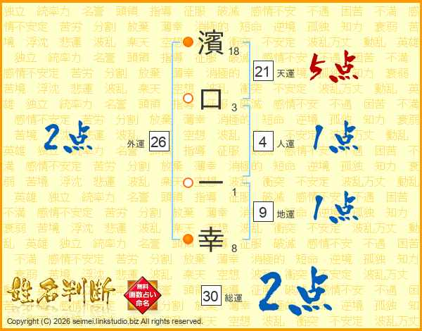 画数の奇数(○陽)と偶数(●陰)の配列で吉凶を占います。どちらかにかたよる名前は大凶名で避ける必要があります。画数の奇数偶数。