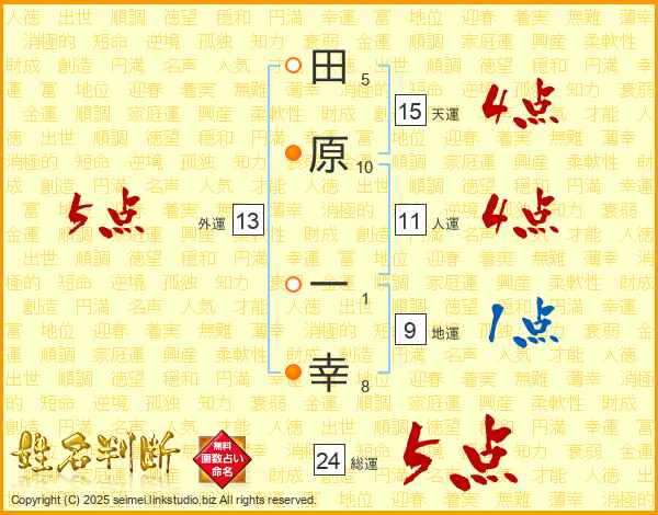 生活面を象徴する運勢です。外部から受ける影響力を表し、結婚運、家庭運や職場、環境への順応性を表します。総運から人運を引いた画数。姓や名が1文字の場合を除く。