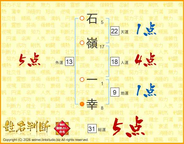 石(5画)嶺(17画) 一(1画)幸(8画)