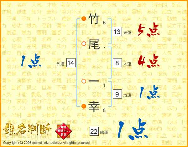 竹(6画)尾(7画) 一(1画)幸(8画)