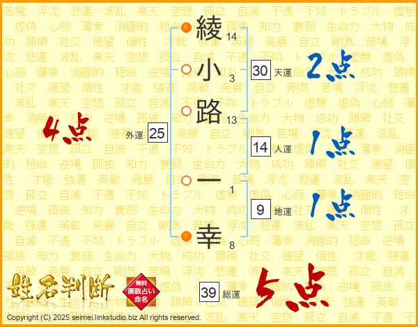 綾(14画)小(3画)路(13画) 一(1画)幸(8画)