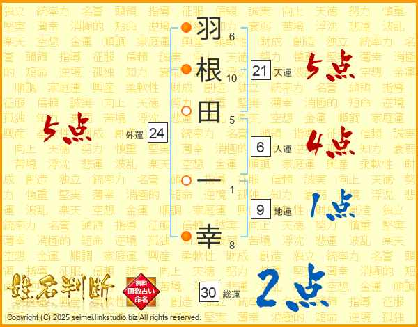 羽(6画)根(10画)田(5画) 一(1画)幸(8画)