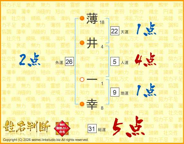 生活面を象徴する運勢です。外部から受ける影響力を表し、結婚運、家庭運や職場、環境への順応性を表します。総運から人運を引いた画数。姓や名が1文字の場合を除く。