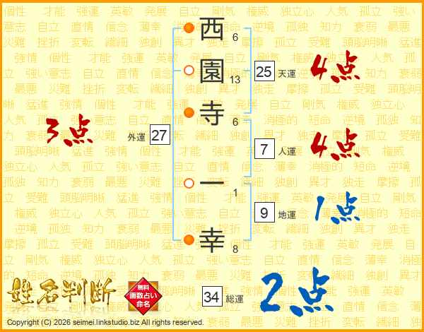 西(6画)園(13画)寺(6画) 一(1画)幸(8画)