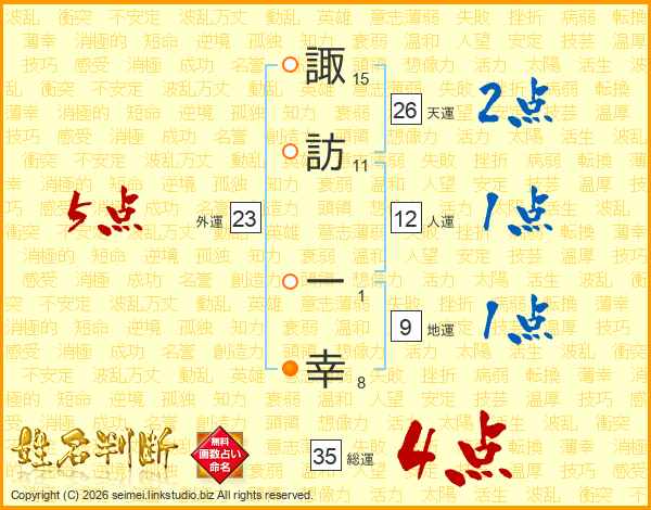 諏(15画)訪(11画) 一(1画)幸(8画)