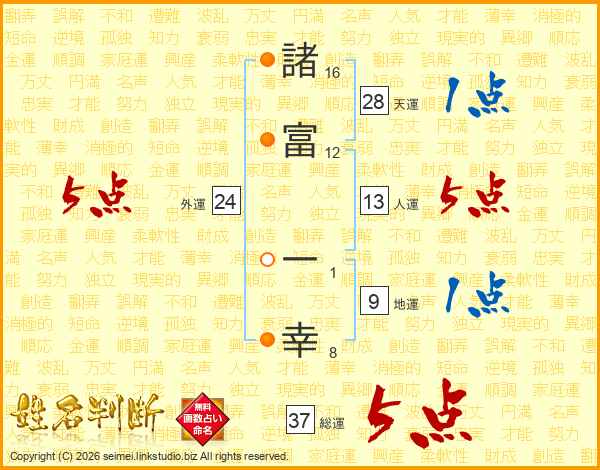 諸(16画)富(12画) 一(1画)幸(8画)